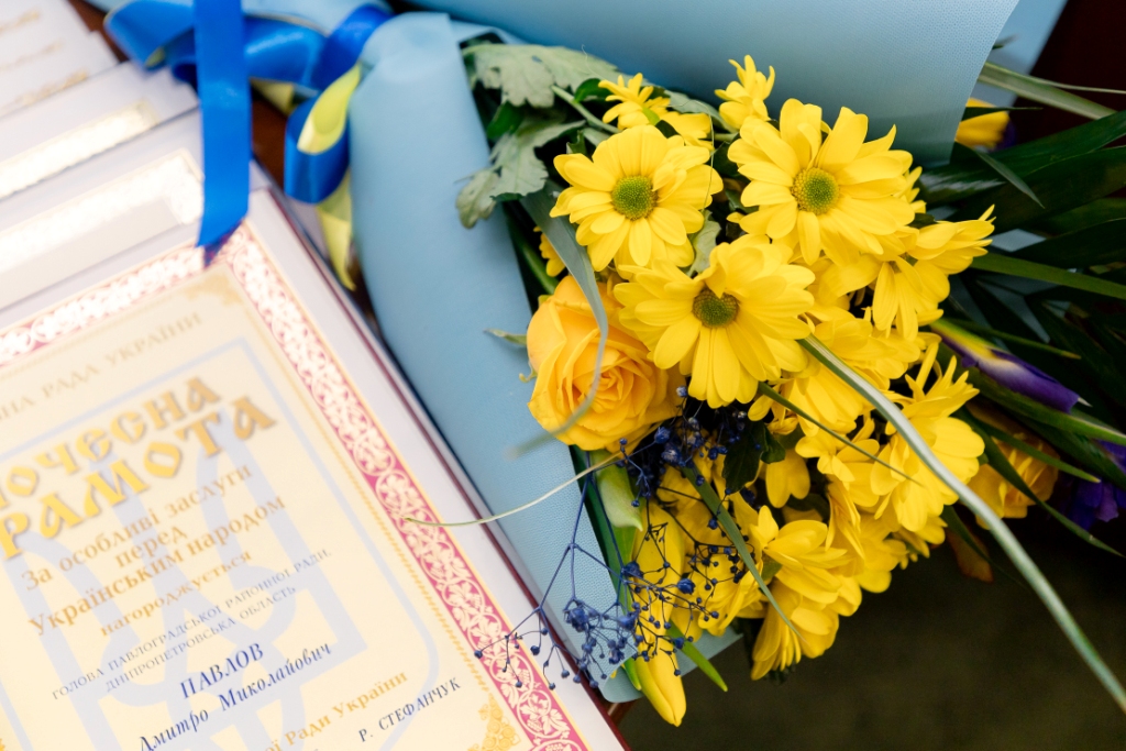 Під час урочистостей в Дніпропетровській обласній раді за дорученням голови Верховної Ради України голова обласної ради Микола ЛУКАШУК вручив Почесну грамоту Верховної Ради України голові Павлоградської районної ради Дмитру ПАВЛОВУ.